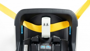 The vehicle belt goes through a pathway marked with direction indicators that are not color-coded. The holes are small but easy to thread through. The lock-off is built into the base and locks back on itself. It is smaller than the width of the vehicle belt, so it was a struggle to fit the belt in and close the lock. While trying to do this, you must hold the belt tight while putting the lock in place. We experienced the lock-off popping open after we thought it was closed and containing the strap.